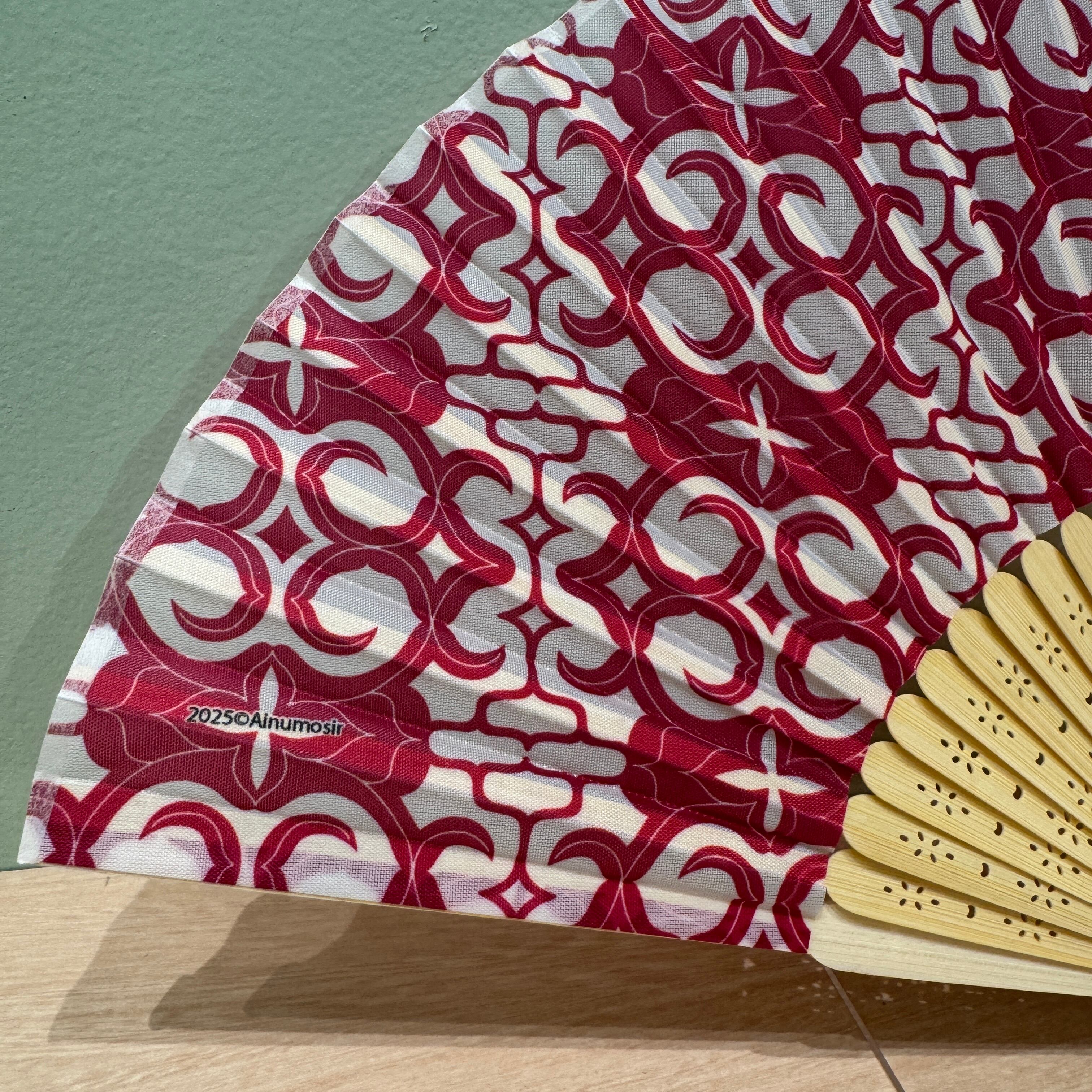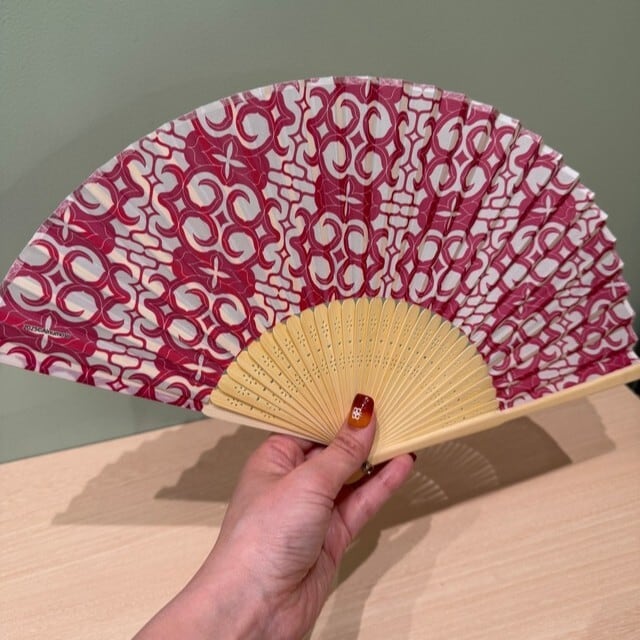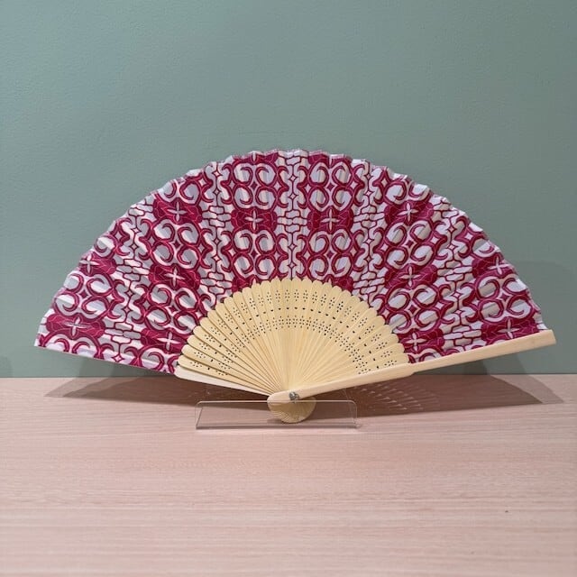 白地に鮮やかなピンクのカパラミプのデザインが映える扇子です。